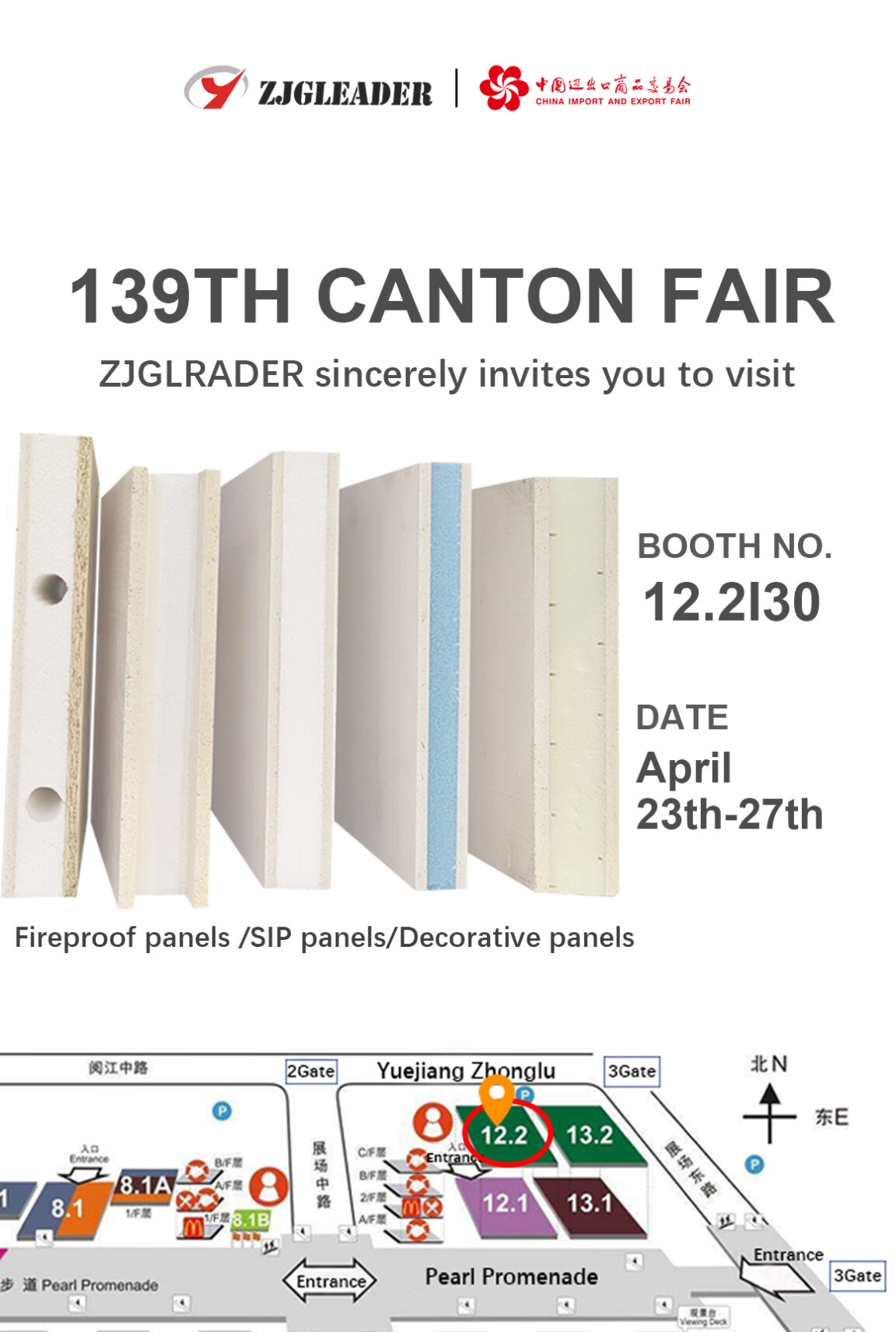 138th Canton Fair Phase 2, Guangzhou,China Date:23th-27th,October,2025 Booth No.:12.1K17,Area B ZJGLEADER products: (1) MGO/MGSO4 board (2) SIP panels (3) Fiber cement external wall Cladding We look forward to your visit